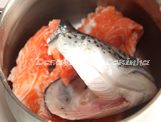 Entretanto a cabeça e a espinha foram logo cozidas em água e sal. Depois foram removidas as espinhas e ficou apenas a carne do peixe.