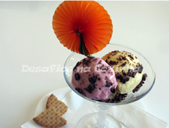 Neste caso foi simples, coloquei uma bola de gelado de cada sabor numa taça, fiz lascas de chocolate e decorei.