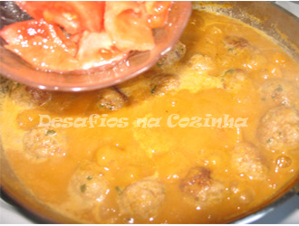 13. Quando as almôndegas estiverem quase cozinhadas, adicionar um tomate partido em pedaços, para que fique cozinhado mas não desfeito;