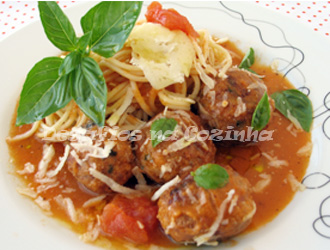 14. Colocar num prato o esparguete e dispor as almôndegas, deitando o molho por cima das almôndegas e do esparguete.