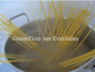 O esparguete deve ser colocado inteiro dentro do tacho e empurrado devagarinho para dentro do tacho.