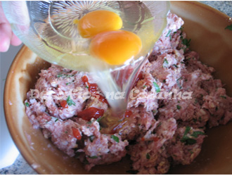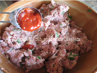 2. Numa tigela misturar a carne, as bolachas trituradas, a salsa, o alho, o ketchup e os ovos;