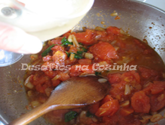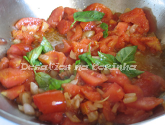 8. Quando a cebola estiver loura, adicionar ao refogado 4 dos tomates picados e deixar cozinhar um pouco;