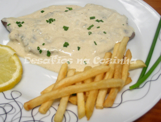 4. Colocar os bifes nos pratos, regar com o molho e polvilhar com cebolinho picado (pode ser cortado com uma tesoura).
