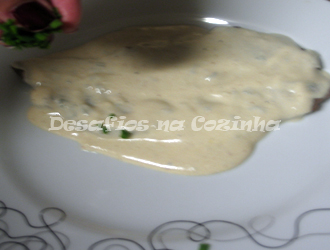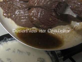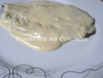 Quando o queijo estiver derretido, adicionar os sucos que os bifes deitaram, a noz moscada, a mostarda e o molho inglês.