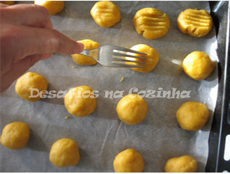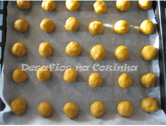 5. Fazer pequenas bolas e dispor num tabuleiro untado com manteiga e polvilhado com farinha ou em cima de papel vegetal de cozinha;