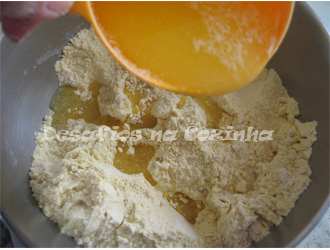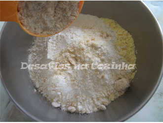 1. Numa tigela juntar as duas farinhas, o açúcar e envolver bem;