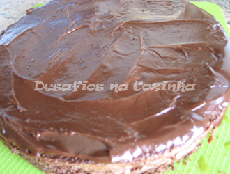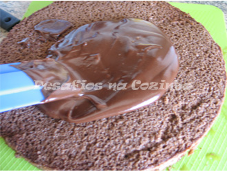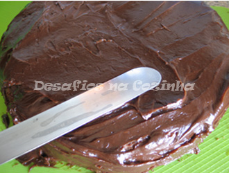 10. Colocar a outra camada de bolo por cima e cobrir com o creme de chocolate, não é necessário ter a preocupação de deixar o creme muito liso porque o granulado de chocolate irá disfarçar qualquer irregularidade;
