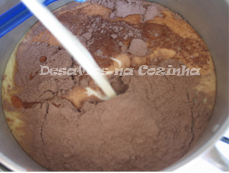 7. Iniciar a confeção do recheio: Colocar num tacho o leite condensado, o chocolate em pó, o leite, a manteiga e uma pitada de sal.