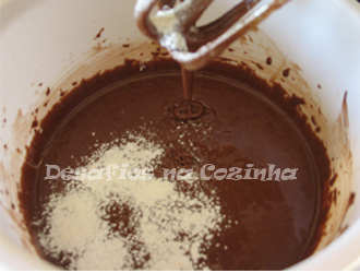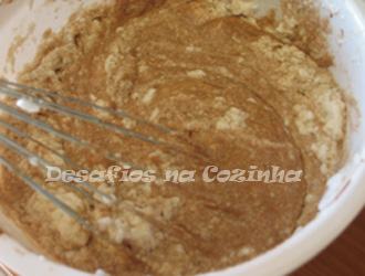 Alternadamente adicionar a mistura líquida e a mistura das farinhas, batendo devagar seja manualmente ou com o robot de cozinha;