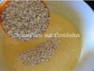 5. Deitar os flocos de aveia aos poucos e ir envolvendo com uma colher ou um batedor de arame, sem bater com a batedeira.