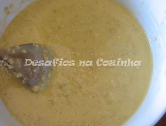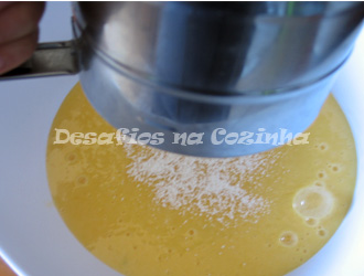 4. Retirar o preparado anterior para uma tigela e juntar a farinha e o fermento peneirados.