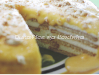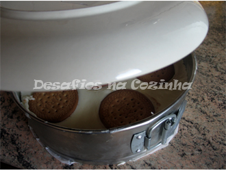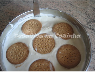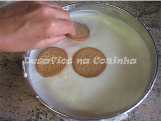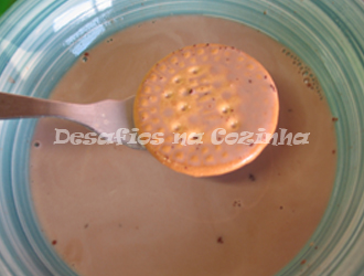 6. Na forma colocar camadas alternadas de creme e bolachas levemente molhadas no leite achocolatado.