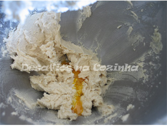 2. Adicionei uma gema e meia clara de ovo, uma pitada de sal e voltei a bater;