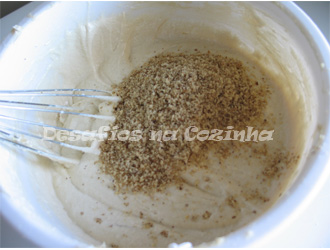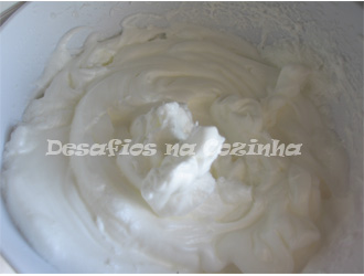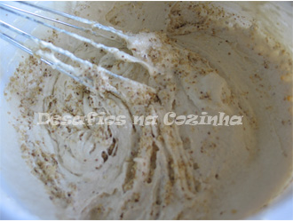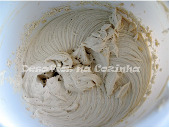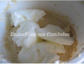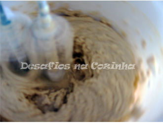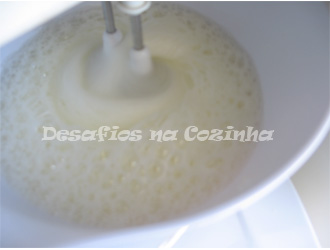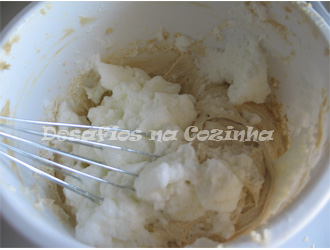 3. Juntar à massa 3 colheres de sopa de claras em castelo e bater em velocidade mínima;