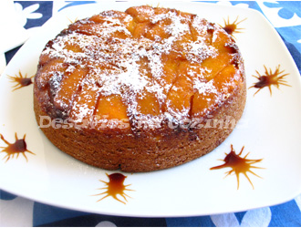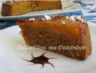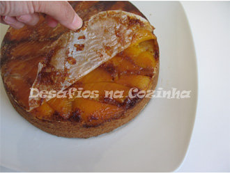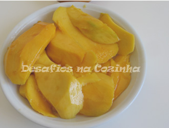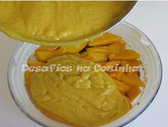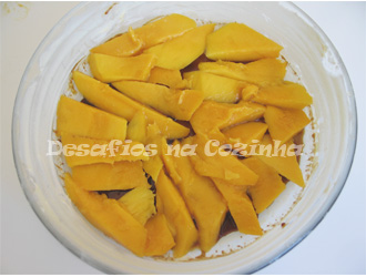 9. Lavar e secar bem uma manga. Cortá-la em fatias ou pedaços e colocar no fundo da forma;
