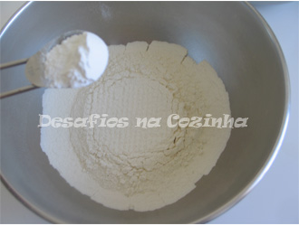 1. Numa tigela misturar a farinha, o fermento, o bicarbonato de sódio e o sal. Reservar;