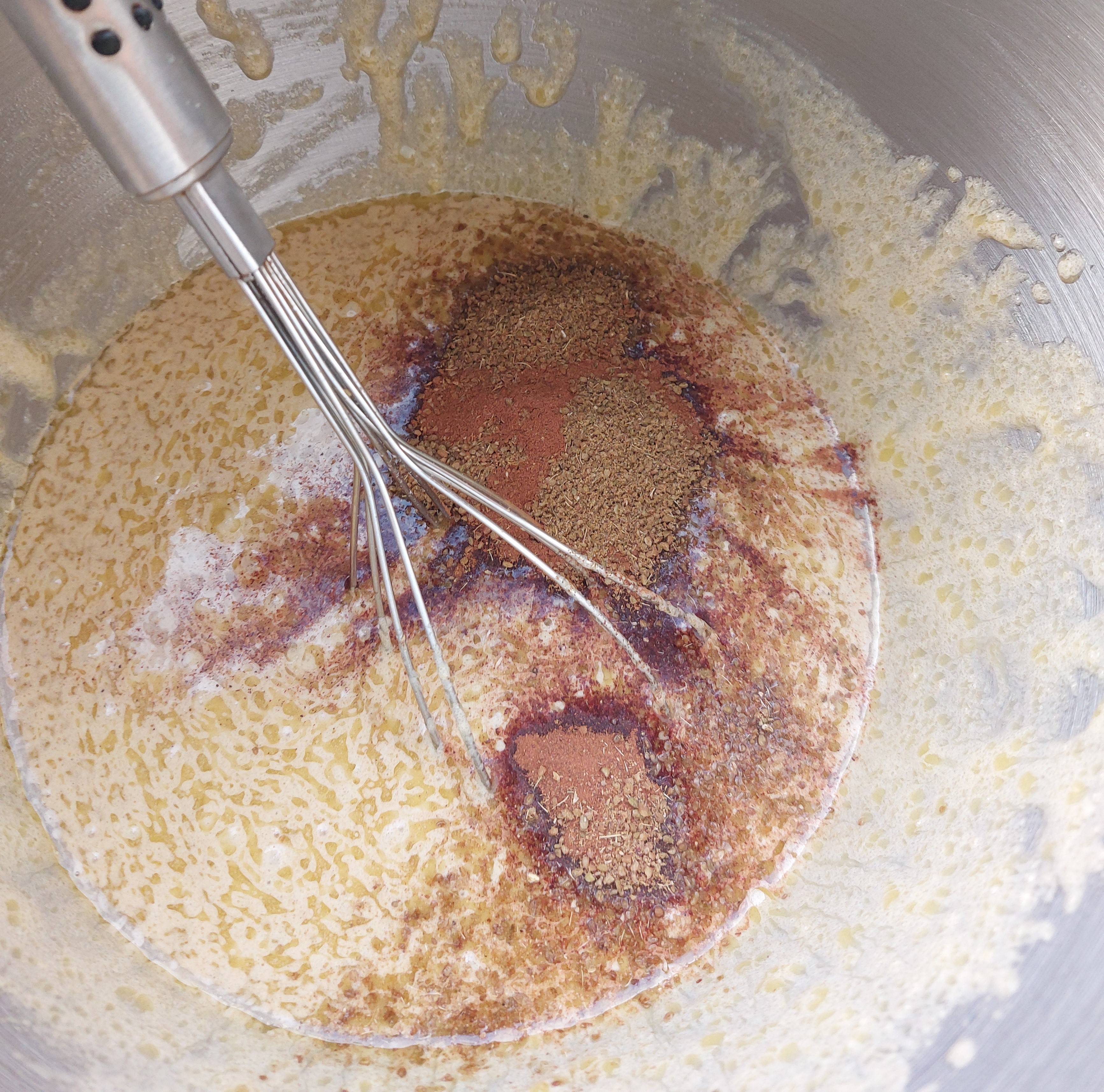 - Bater as gemas com o açúcar até ficar um creme fofo e esbranquiçado, adicionar o azeite e continuar a bater;