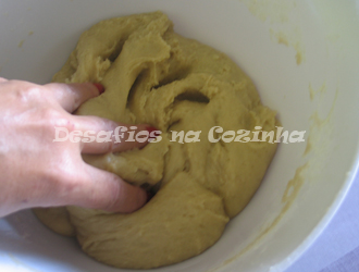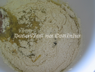 3. Adicionar a farinha misturada com o fermento, aos poucos, até a massa apresentar uma consistência que desprenda das mãos, seja tendível mas não demasiado seca;