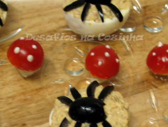3. Encaixar cada meio tomate no pedaço de queijo;