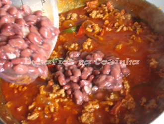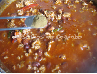 8. Quando a carne estiver cozinhada, o feijão macio e o molho com a consistência desejada, juntar os cominhos e o tabasco ou piri-piri (aos poucos e provando sempre para apenas ficar picante quanto baste). Mexer o chili e desligar o lume.
