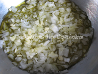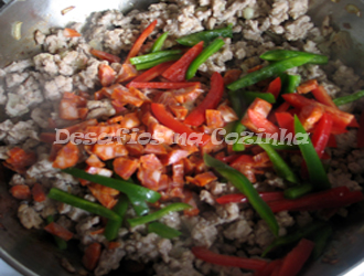 Quando a cebola estiver loura, juntar a carne picada e deixar fritar;