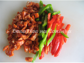 2. Juntar a linguiça partida em meias rodelas e o pimento partido em tiras pequenas;
