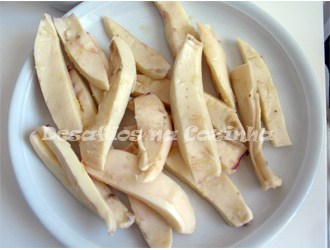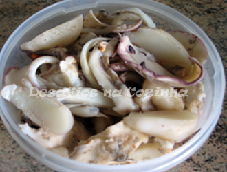 6. Tire os pedaços de choco da marinada e limpe o alho e louro que fique agarrado.