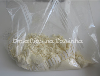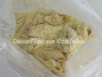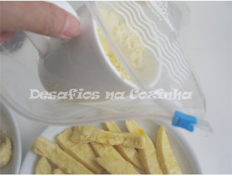 7. Numa caneca misture farinha de milho e farinha de trigo em partes iguais. Tempere com sal e despeje num saco plástico;