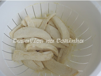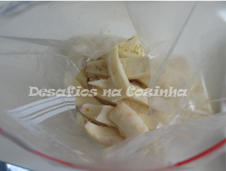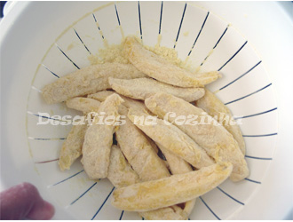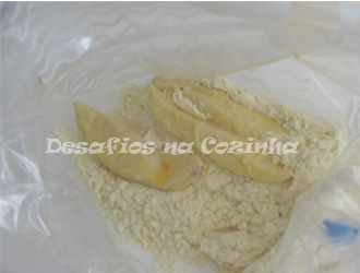 8. Coloque os pedaços do choco no saco e abane de forma a que todos fiquem bem envoltos em farinha. Retire do saco e sacuda bem;