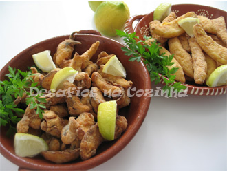 Cozinhei os chocos em água cerca de 15 minutos para assegurar que não ficavam rijos, mas o choco pode ser frito completamente cru. O risco é o choco não ser tenro.
