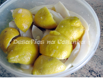 4. Em tigelas separadas, tiras e restantes partes do choco, tempere com muito alho, folhas de louro partidas, sal, piri-piri e regue com bastante limão, de modo ao choco ficar submerso. Coloque as cascas dos limões espremidos sobre o choco.