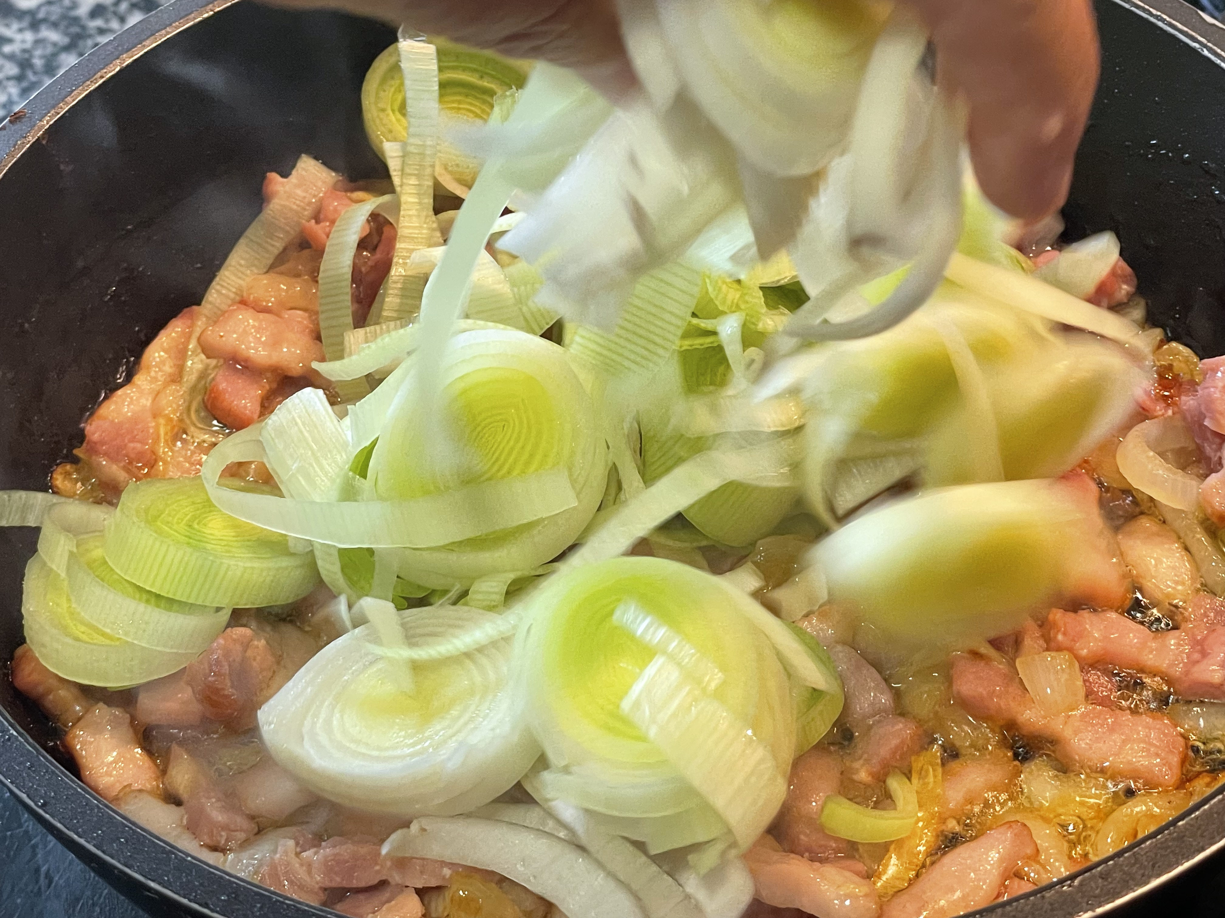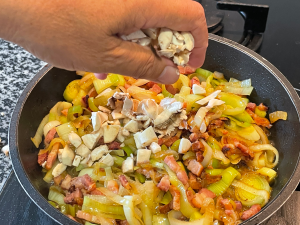 Juntar o alho francês cortado em rodelas e um pouco de vinho branco. Deixar cozinhar.
