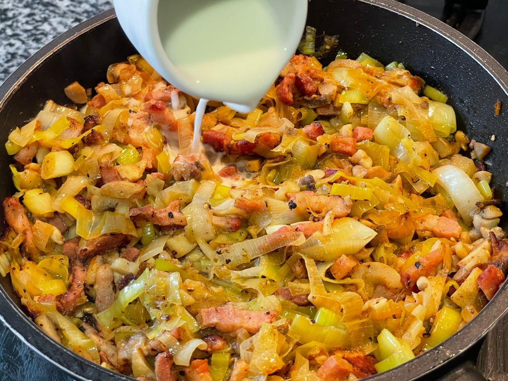 4. Adicionar o bacon e deixar fritar um pouco.