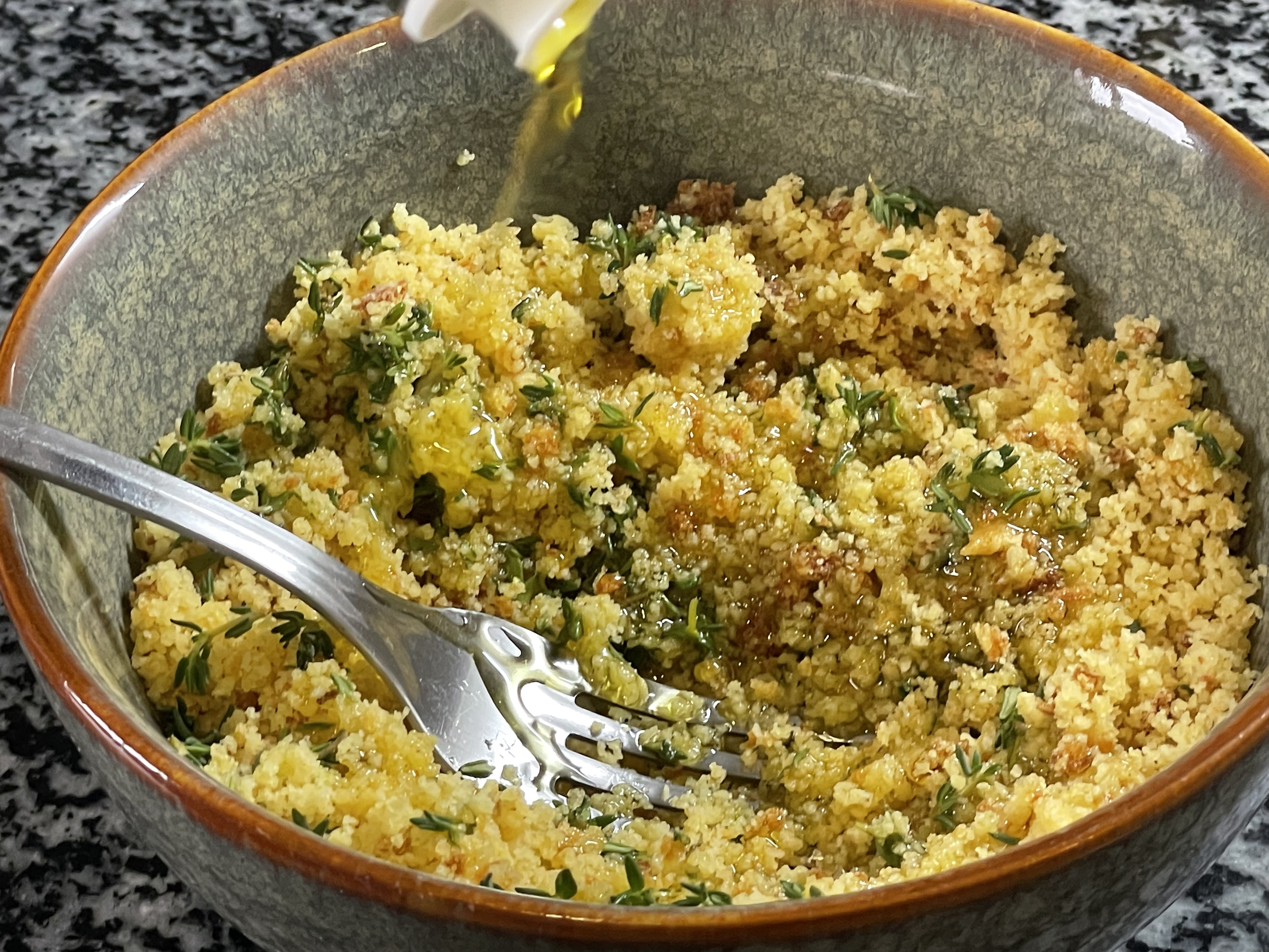 7. Triturar as 2 fatias de broa de milho, juntar as folhas de tomilho e adicionar azeite até obter uma pasta para cobrir os cogumelos. Levar ao forno a 180ºC durante cerca de 20 minutos ou até ficarem dourados.