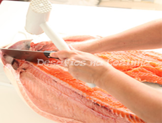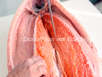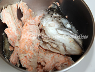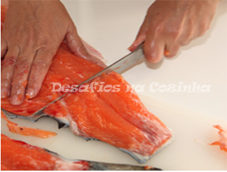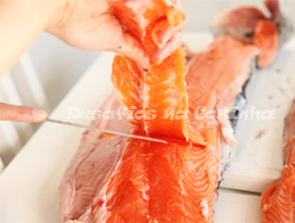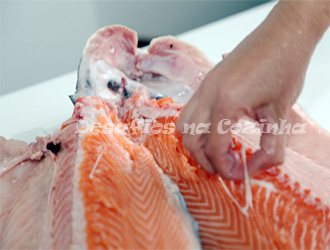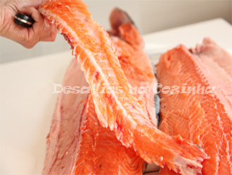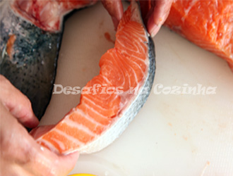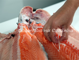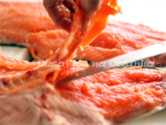Se o salmão for grande, a maioria das espinhas saem bem puxando apenas com a mão.