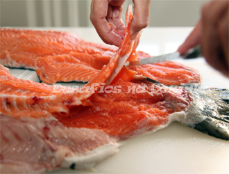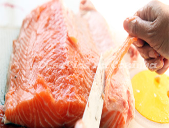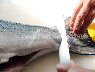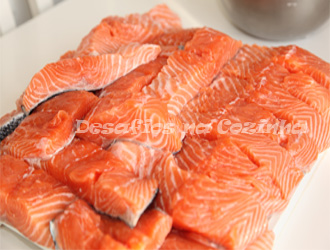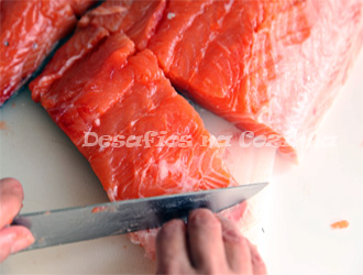 Peça na peixaria para tirarem as escamas e as tripas ao salmão.