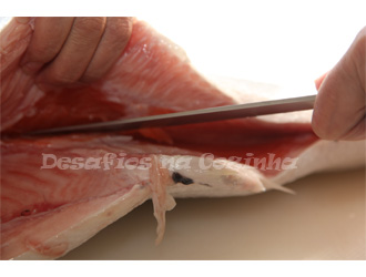 Muitas das espinhas da barriga do peixe e alguma gordura é facilmente removida aparando com a faca.