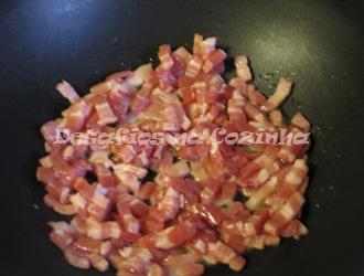 3. Numa frigideira deitar o bacon, os dentes de alho picados, o azeite e a malagueta (opcional);