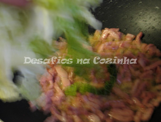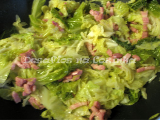 Quando o bacon estiver a começar a ficar frito, juntar a couve e saltear envolvendo todos os ingredientes.