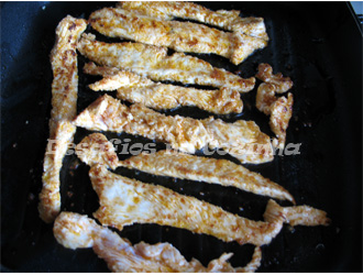 9. Aquecer o grelhador e colocar as tiras de peru a grelhar. Atenção que o peru grelha rapidamente, não deixe secar a carne;