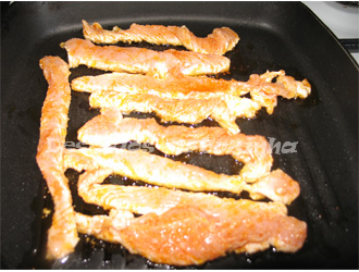 4. Cortar o bife em tiras e temperá-lo com o molho de paprika preparado;