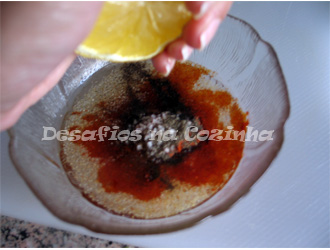 3. Numa taça deitar o óleo, o alho em pó, a paprika, sal, pimenta, sumo de limão e pedaços do limão que foi espremido;