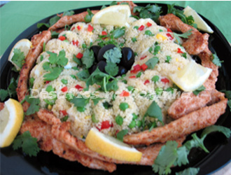 11. Em volta dos cuscus colocar as tiras de carne, deitar por cima coentros pouco picados e decorar com azeitonas e limão.