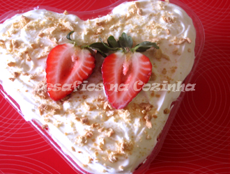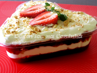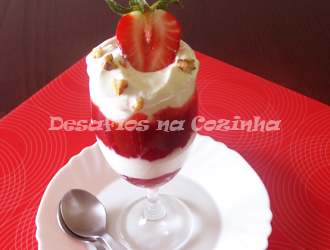 5. Num copo ou taça, colocar camadas alternadas de doce de morango, creme de iogurte, pedaços de noz e bolacha, de novo doce, pedaços de nozes e bolacha, creme de iogurte e polvilhar com nozes e bolacha a gosto. Decorar com meio morango.