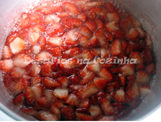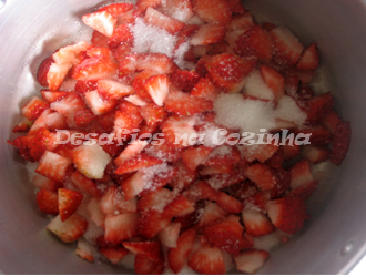 2. Num tacho juntar 300g de açúcar, o sumo de limão e os morangos aos pedaços.
