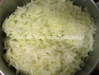 3. Colocar os chuchus ralados num tacho, juntar o açúcar, cascas de limão, canela e uma pitada de sal.