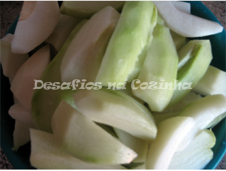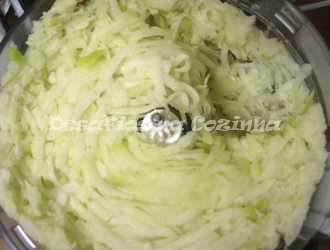 2. Triturar os chuchus no processador ou com um ralador de cenoura.