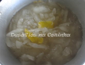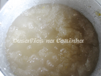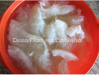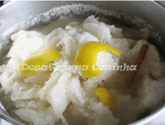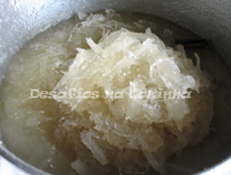 5. Passadas 24 horas, escorrer a gila e colocá-la num tacho juntamente com o açúcar, casca de limão, pau de canela e 2 copos de água;