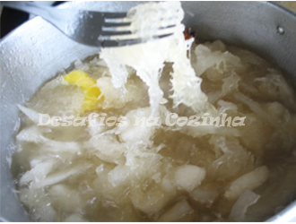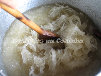 6. Deixar ferver e quando o doce ganhar consistência, mas ainda com calda, retirar quase todos os fios para um prato.